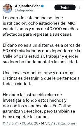 El director de operaciones del MIO, Daniel Parra, señaló que los hechos obligaron a modificar la operación del sistema en el corredor de la Calle 5, una de las principales troncales de la ciudad.